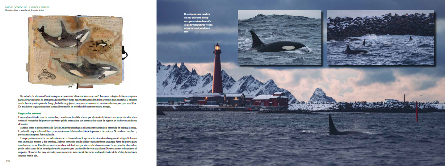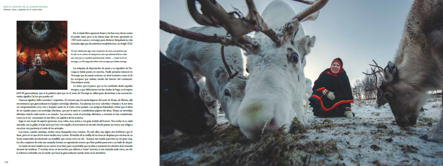Hemos vivido muchas noches al amparo del fuego de campamento y de la lumbre de una cabaña, esperando a ver como la aurora boreal iluminaba el cielo. Antes de salir a fotografiarlas, hemos aprendido de científicos, pescadores, ganaderos y pastores de renos, como es su relación con la tierra que habitan, con la biodiversidad con la que comparten territorio y nos han contado, cada uno a su manera, como es vivir Bajo el Sonido de la Aurora Boreal.