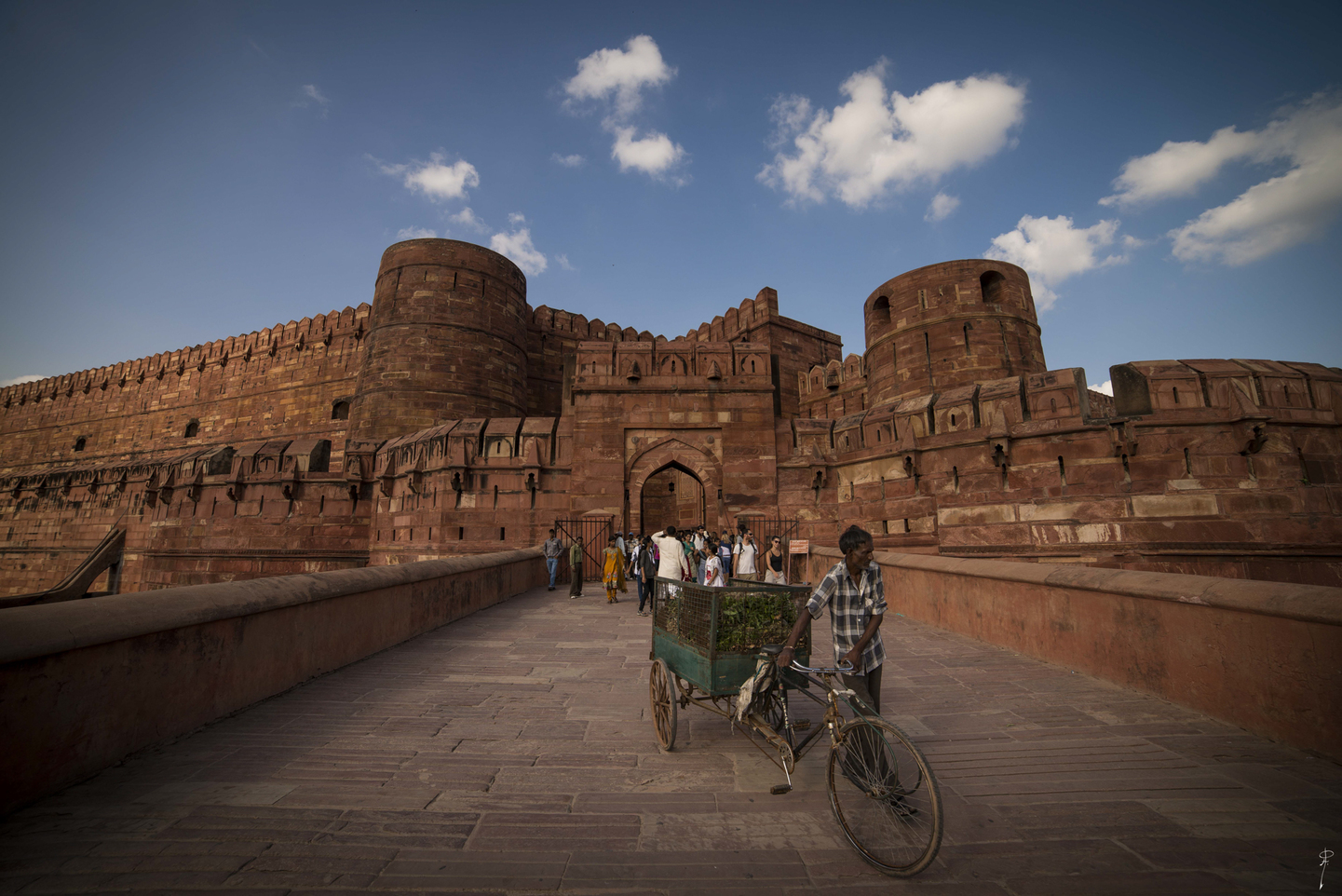 El Fuerte Rojo de Agra, conocido por los lugareños como “Lal Quila” está situado a orillas del río Yamuna, en la ciudad de Agra, y conocido como fuerte rojo porque está construido con arenisca roja que le asigna este tono inconfundible. El fuerte de Agra fue declarado Patrimonio de la Humanidad por la UNESCO en el año 1983. La construcción, data del año 1565, y está concebida como un palacio amurallado rodeado de una profunda fosa de agua. La puerta de Amar Singh es la de acceso a la fortaleza. Dentro podremos visitar los numerosos palacios y edificios señoriales construidos por Akbar, emperador mogol y que después fueron utilizados por los sucesivos gobiernos del Imperio Mogol, como base de operaciones.