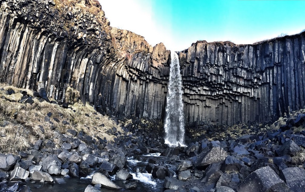 El primero de los senderos nos llevará hasta la cascada de Svartifoss. La Cascada Svartifoss recibe el sobrenombre de Cascada Negra por el color de las columnas de basalto de origen volcánico que la rodean. Estas columnas hexagonales se formaron al cristalizarse la lava de forma muy lenta.